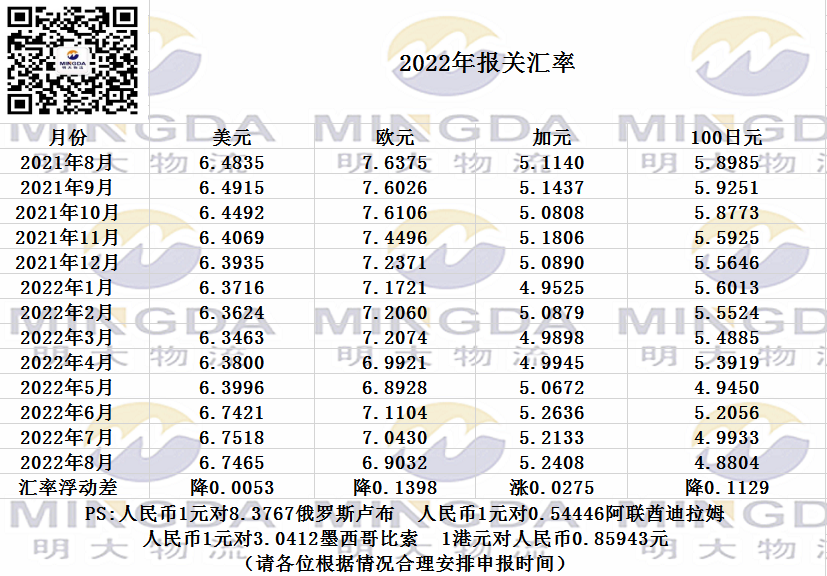 2022年8月海关申报汇率
