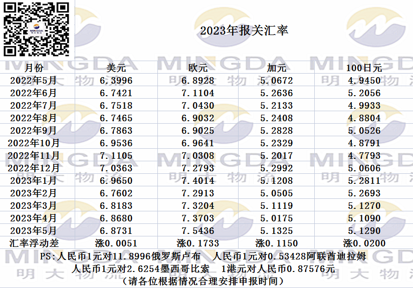 2023年5月海关申报汇率