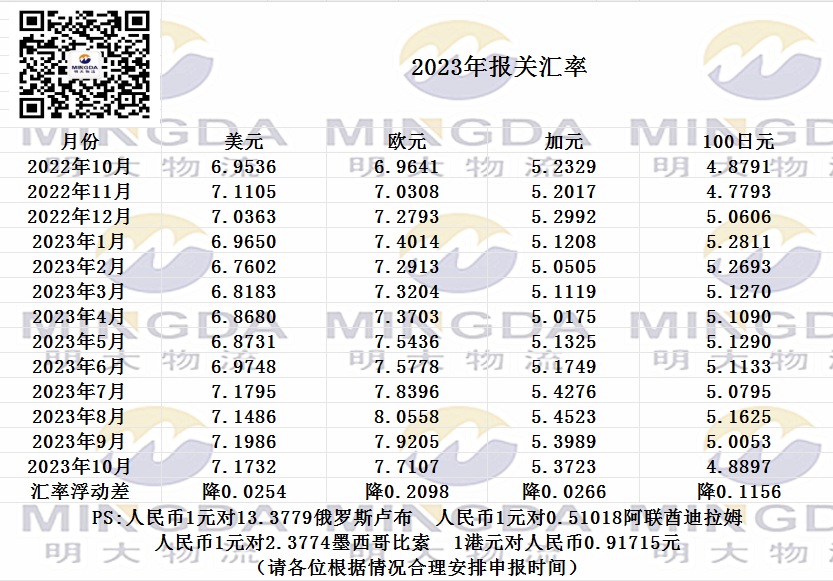 2023年10月海关申报汇率