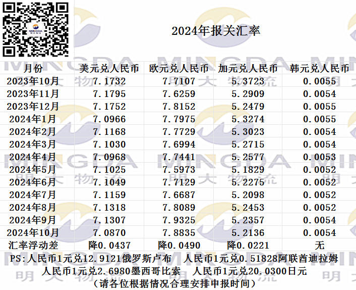 2024年10月海关申报汇率