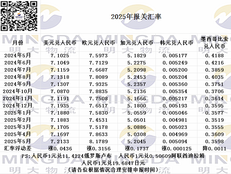 2025年5月海关申报汇率