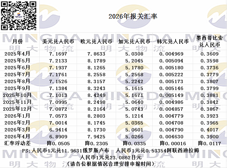 2026年4月海关申报汇率